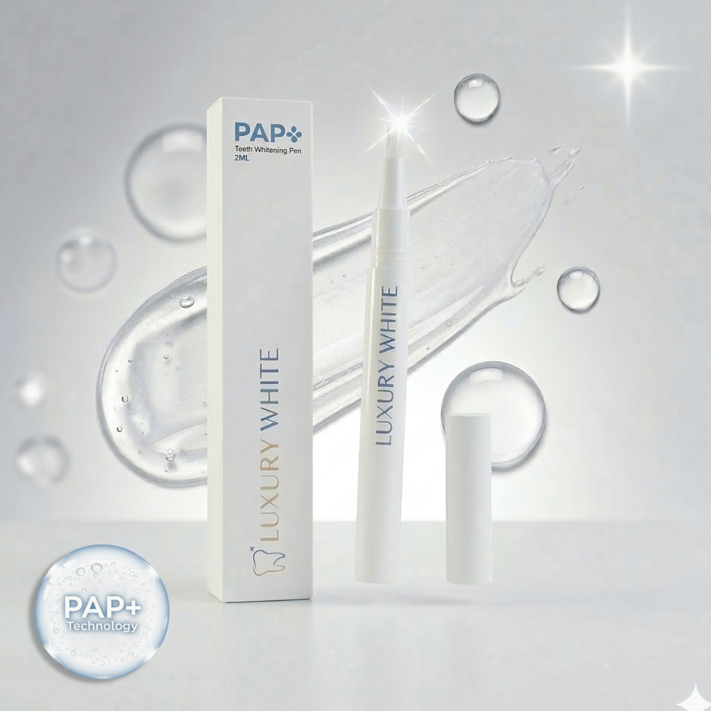 Möchtest du hellere Zähne auf sichere und einfache Weise? Der PAP+ Whitening Pen™ von Luxury White ist die Lösung! Mit diesem innovativen Zahnaufhellungsstift kannst du deine Zähne zu Hause um bis zu 8 Nuancen weißer machen – ganz ohne Zahnarztbesuch, Empfindlichkeit oder Nebenwirkungen. Bei Luxury White bist du sicher von höchster Qualität und dem besten Preis für deine Zahnaufhellungsprodukte.
